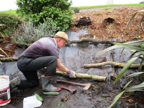 Weed mats were refreshed reformed and mulch spread and contained by horizontal logs.